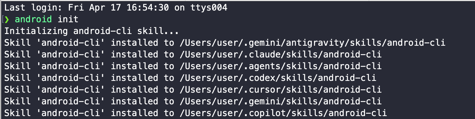 android init 은 에이전트 스킬 디렉토리 초기화 등 환경 셋업 명령이며, 설치 직후 1회 실행한다. claude code, codex, gemini-cli, cursor, copilot, antigravity 와 같은 coding agent에 android-cli skill이 설치된다.