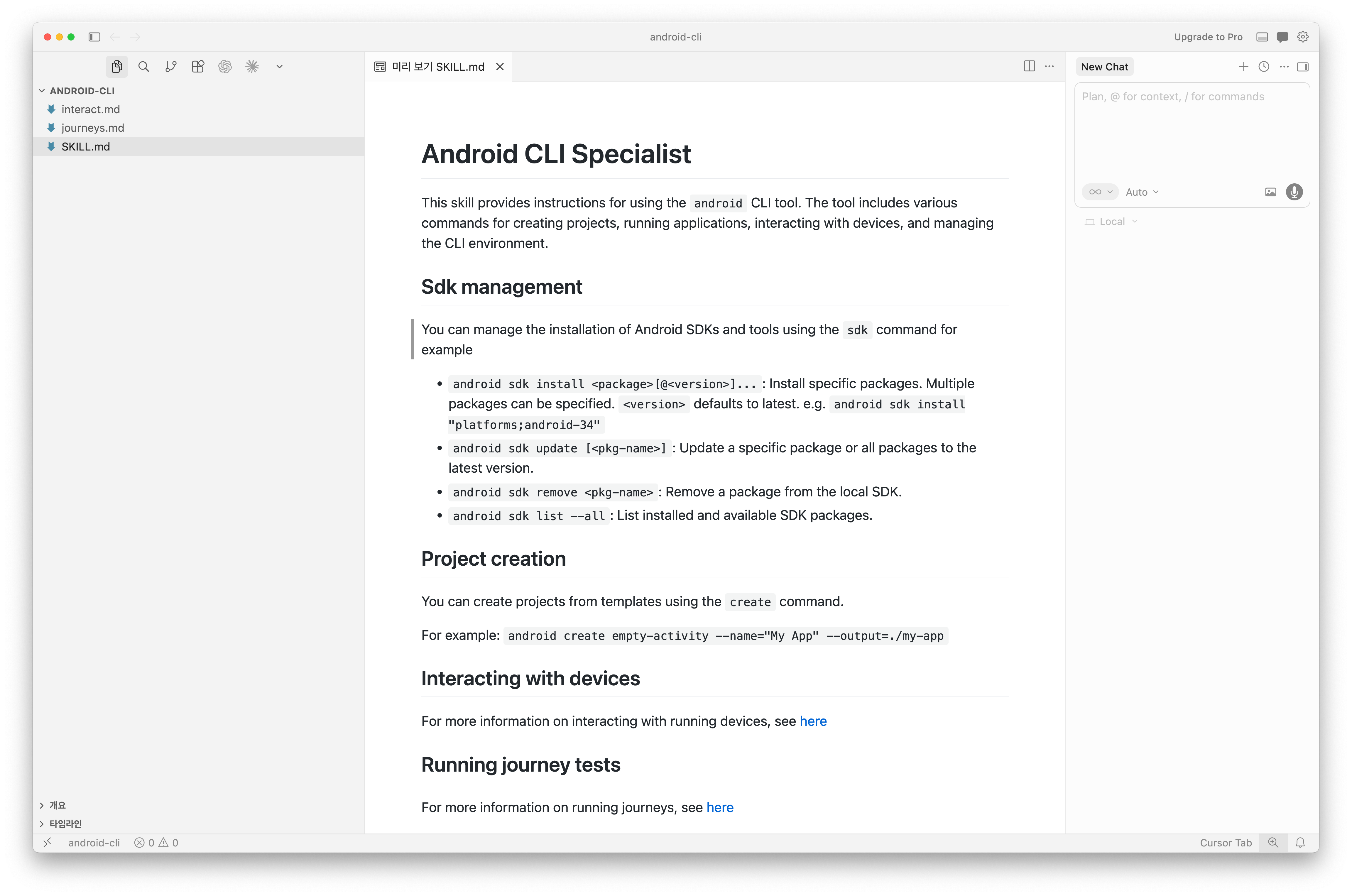 android CLI 는 이 두 가지를 layout + 통합된 서브커맨드로 해결한다.